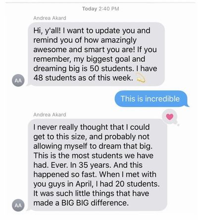 "This is the most students we have had. Ever. In 35 years. And this happened so fast. When I met with you guys in April I had 20 students. I have 48 students as of this week. It was such little things that have made a big difference."